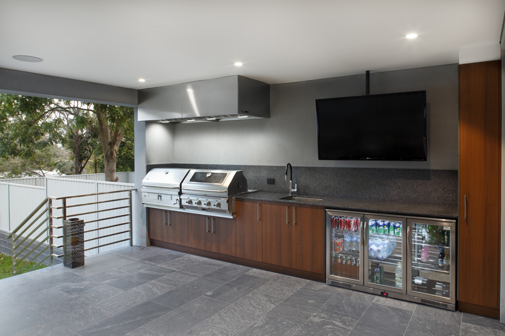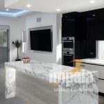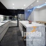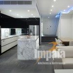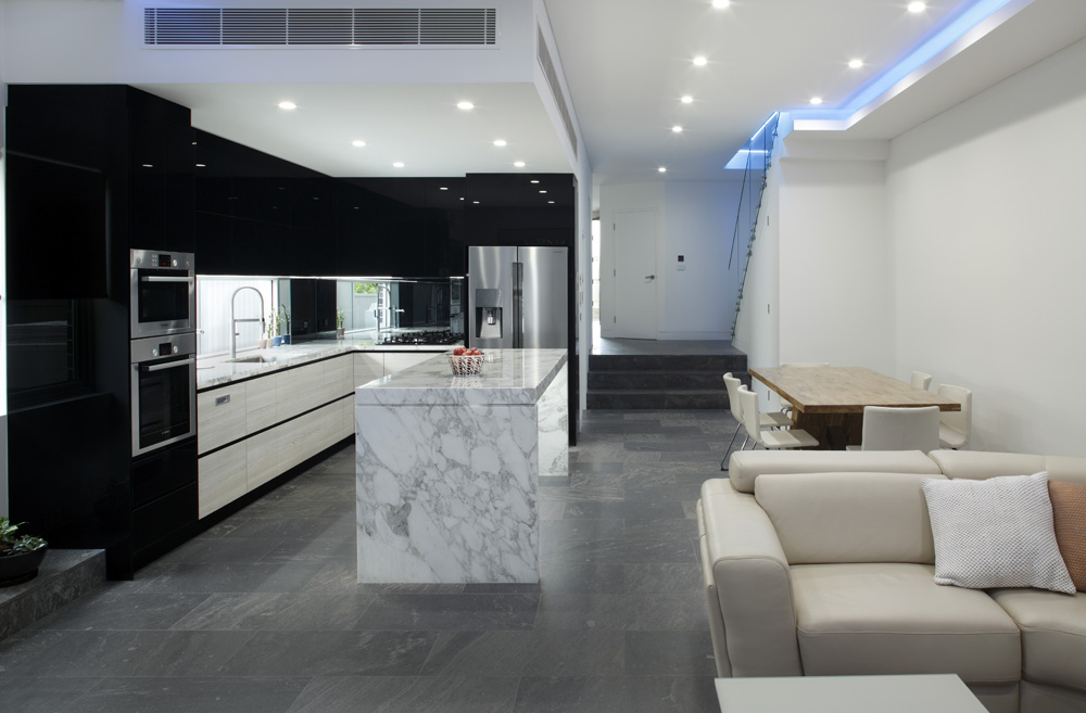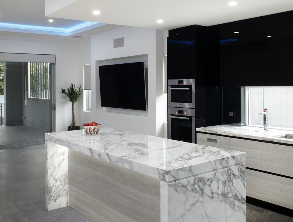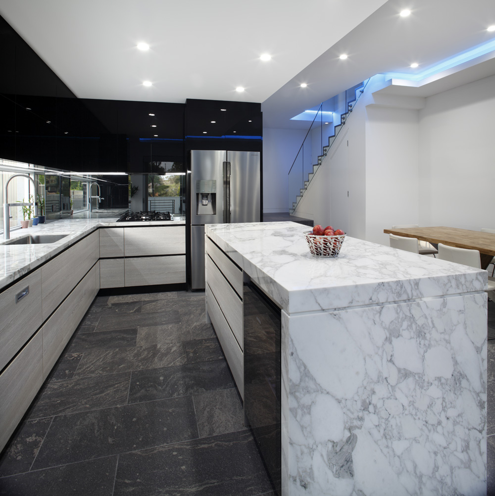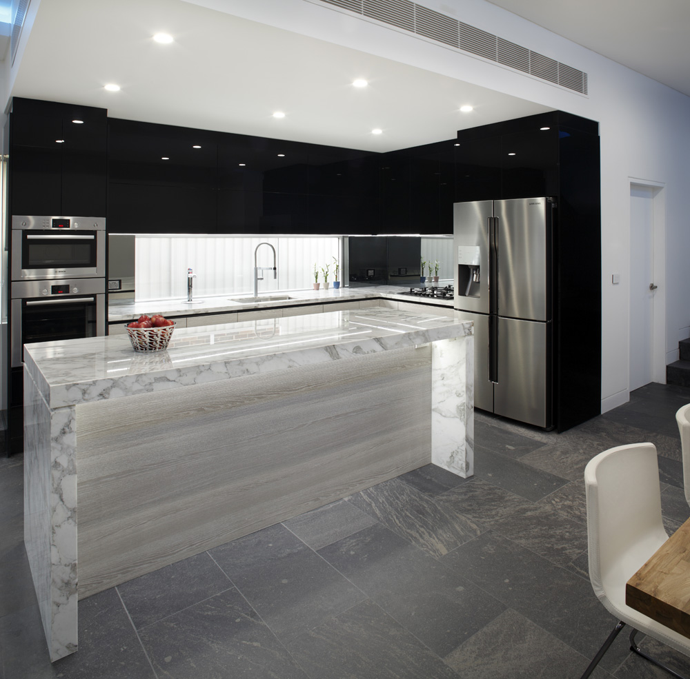 From the use of quality materials, such as the Calacatta marble benchtop and the black gloss cabinetry to the effective and spacious layout, this kitchen is a stylish success. With a modern, futurist, industrial feel, created by the unusual combination of stainless steel, black gloss and gorgeous natural stone, this space is a true success.”