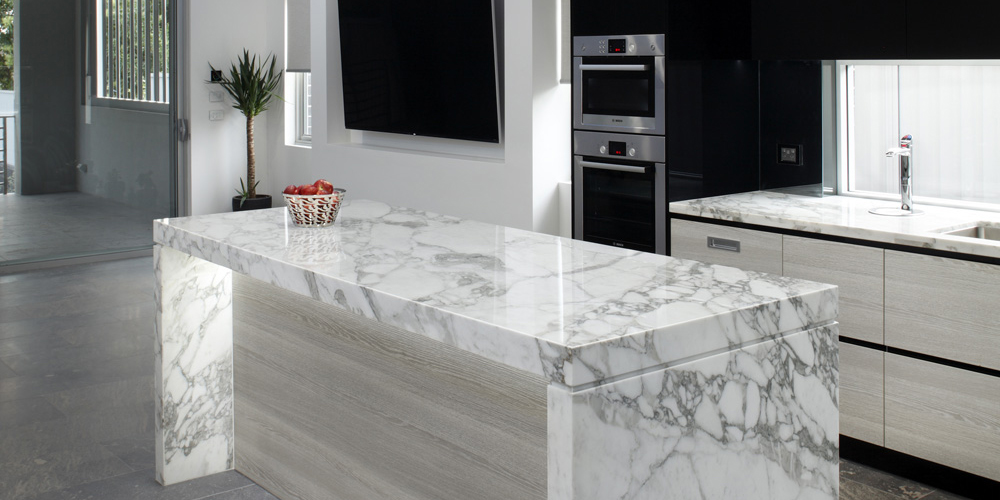 ~Benchtop 40mm Calacatta marble pencil edge and 80mm New York marble pencil edge for island