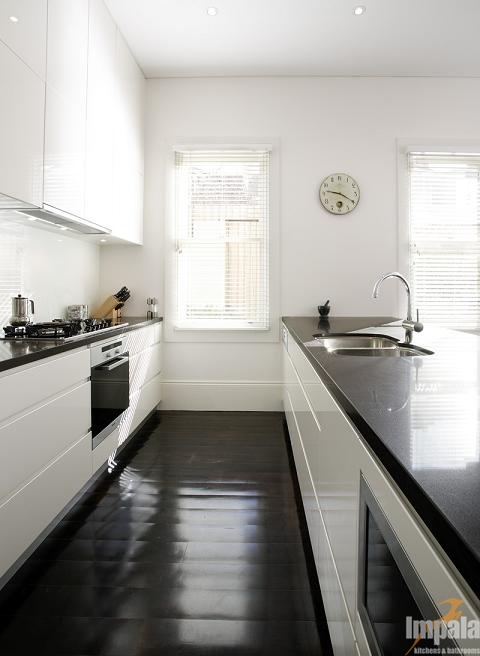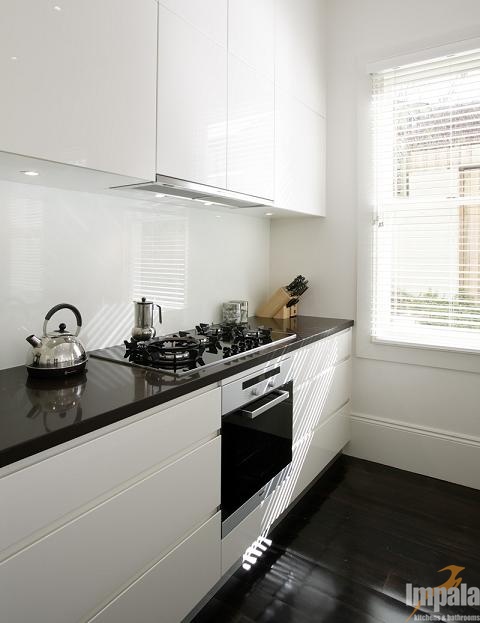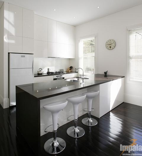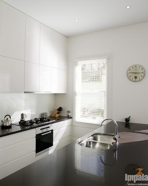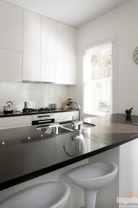 Impala’s client was renovating an older terrace house and extending the back space. The extension was to allow a larger kitchen downstairs and to bring more natural light into the dwelling. The client wanted a custom kitchen, which maximised storage. This was important as the terrace itself was not large and storage space needed to be maximised, standard units would not achieve this. The deeper end of the island enables further storage which can be accessed from the seating side with touch catches. The brief was crisp, white joinery with sleek lines and minimum fuss and a contemporary look. To meet this aspect of the brief, Impala built tall cabinets to the ceiling with a slim shadowline, opted for no handles on the entire kitchen and recommended flat profile doors. The result is a stunning white kitchen with a chocolate stone top which reflects the client’s minimalist style and need for storage.