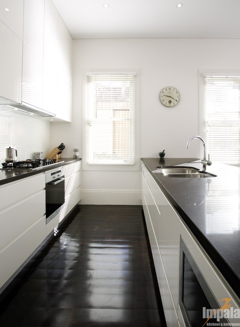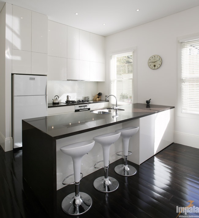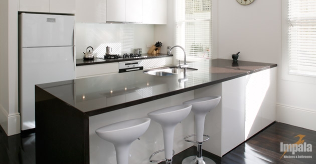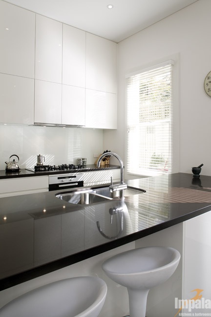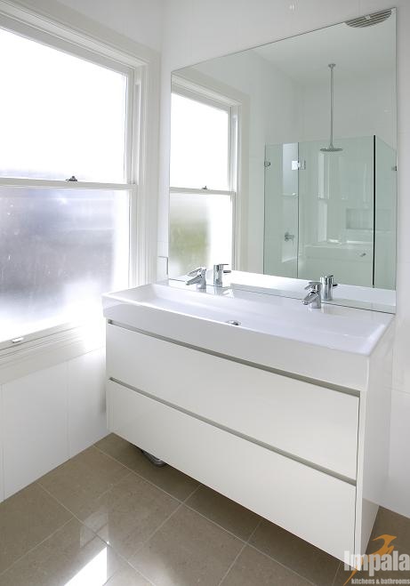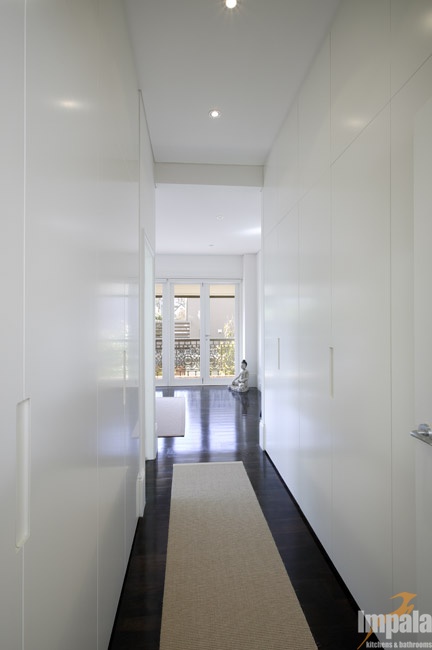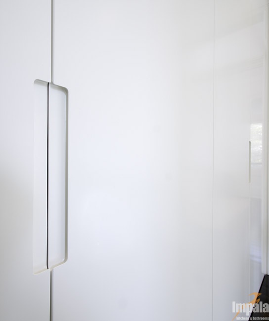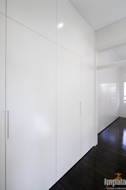 Impala’s client was renovating an older terrace house and extending the back space. The extension was to allow a larger kitchen downstairs and master bedroom upstairs and to bring more natural light into the dwelling. The client wanted a custom kitchen, wardrobes and vanities. This was important as the terrace itself was not large and storage space needed to be maximised, standard units would not achieve this. The brief was crisp, white joinery with sleek lines and minimum fuss.