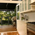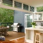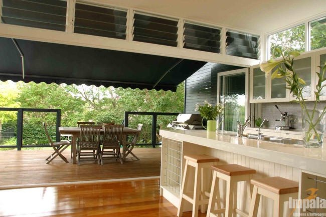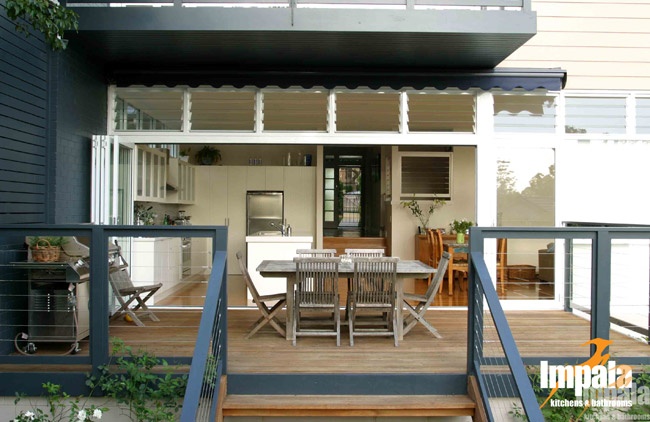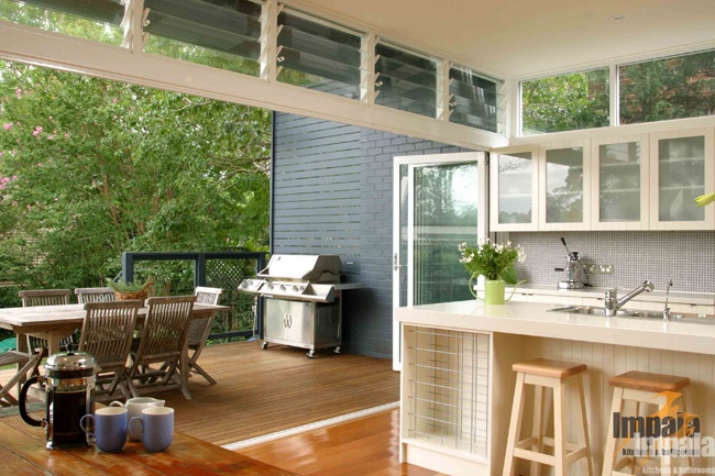 The client brief was to design a kitchen for a small family to suit the open space extension in a freestanding cottage in Sydney’s inner west. The kitchen was to be warm, inviting and functional. Impala recommended slatted polyurethane doors in an antique white hue. These were teamed with discreet top mounted handles to balance the texture on the doors. Warm, sliver grey mosaics were used for the splashback, to compliment the strong blue colour used on the home’s exterior. Frosted glass doors in over head cabinets were used for practicality but also to keep textures consistent with the extensive use of glass in the windows and louvers above the kitchen space. A thick bench top on the island anchors the space and the island provides seating for the family of three. A wire wine rack either side on the island is delicate and practical, completing the kitchen design symmetry.