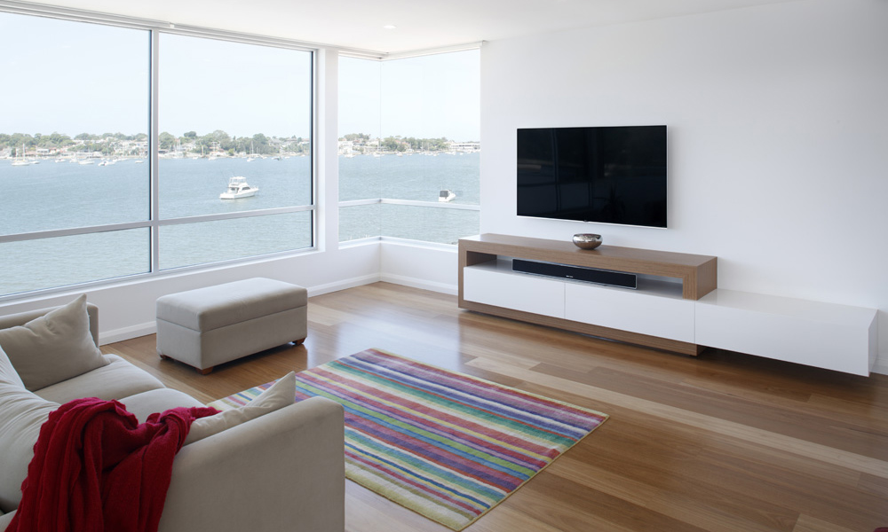 4. In the open living space, the client wanted a small contemporary TV unit. A cantilevered bank of drawers flanked with timber veneer was designed for this purpose (matching the kitchen materials), making the unit an unobtrusive piece and allowing the water views to be the main focus.