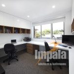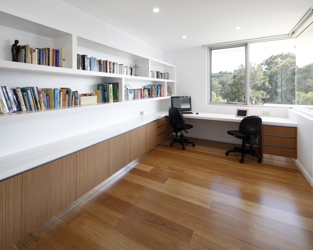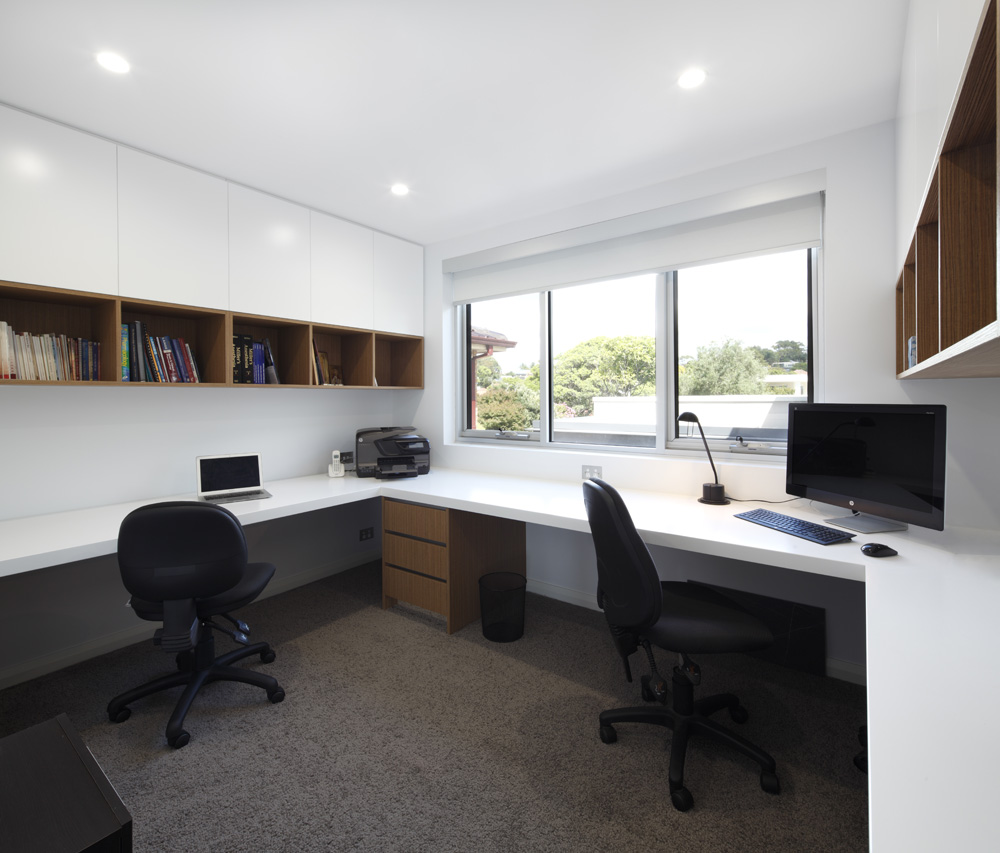 1. The study joinery is a combination of satin polyurethane and timber veneer. Lots of bench space was important as well as cabinets to conceal paperwork, open shelving was used but kept to a minimum to reduce clutter. The feel was to be contemporary and neutral yet tactile.