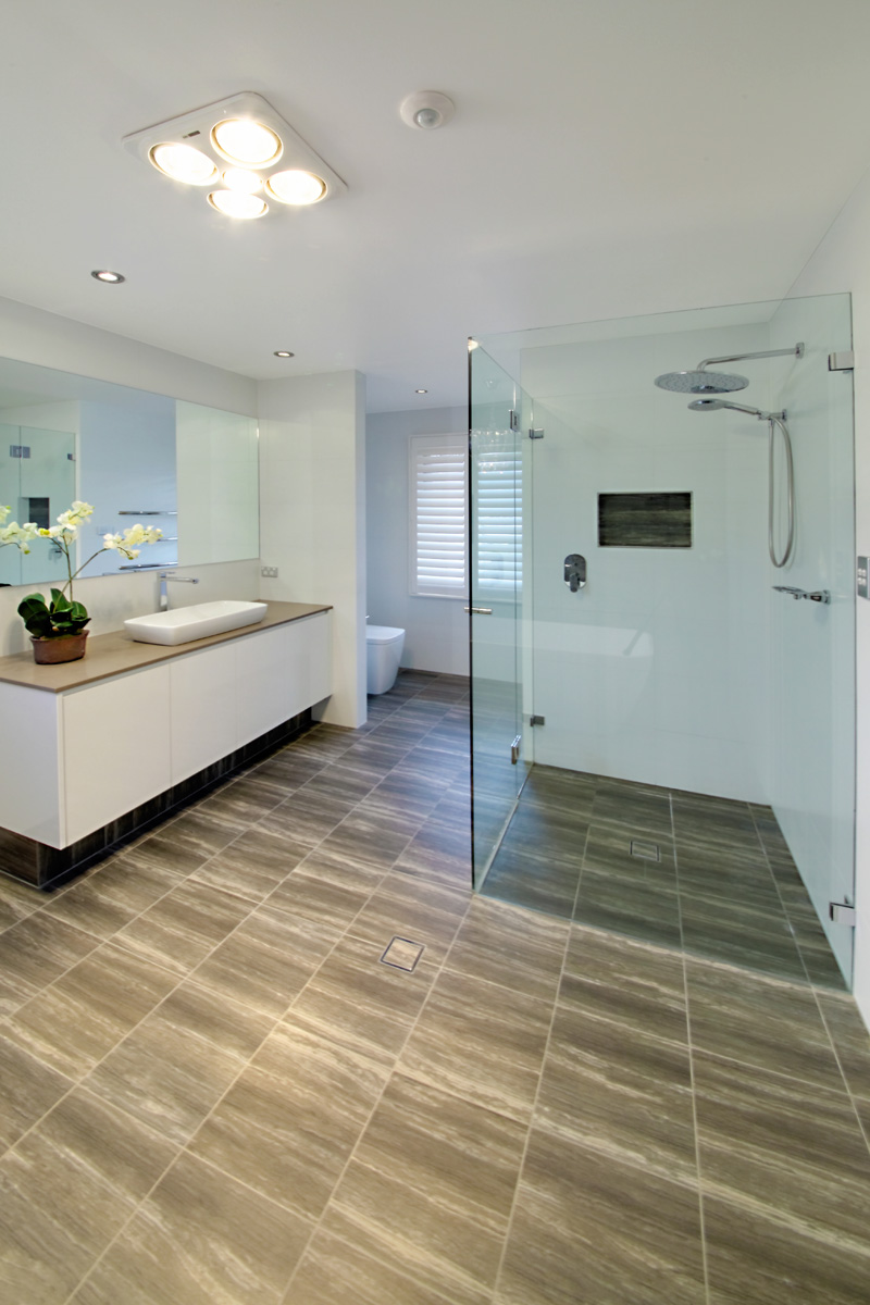 3. A large oversized vanity with vessel basin gives plenty of storage and bench space. A sandy coloured stone bench top was chosen to add warmth and allow the basin to contrast.